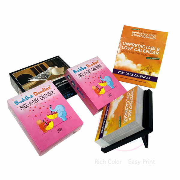365-dnevno tiskanje koledarja z odtrganjem strani na dan pomeni enodnevno tiskanje enega lista, enostransko ali dvostransko tiskanje. Večina naših 365 Days Page na dan natisne koledarje z mat umetniškim papirjem, sijajnim umetniškim papirjem in nepremazanim ofsetnim papirjem. Material papirja je odvisen od umetniškega dela. Priljubljeno v 80gsm-105gsm.